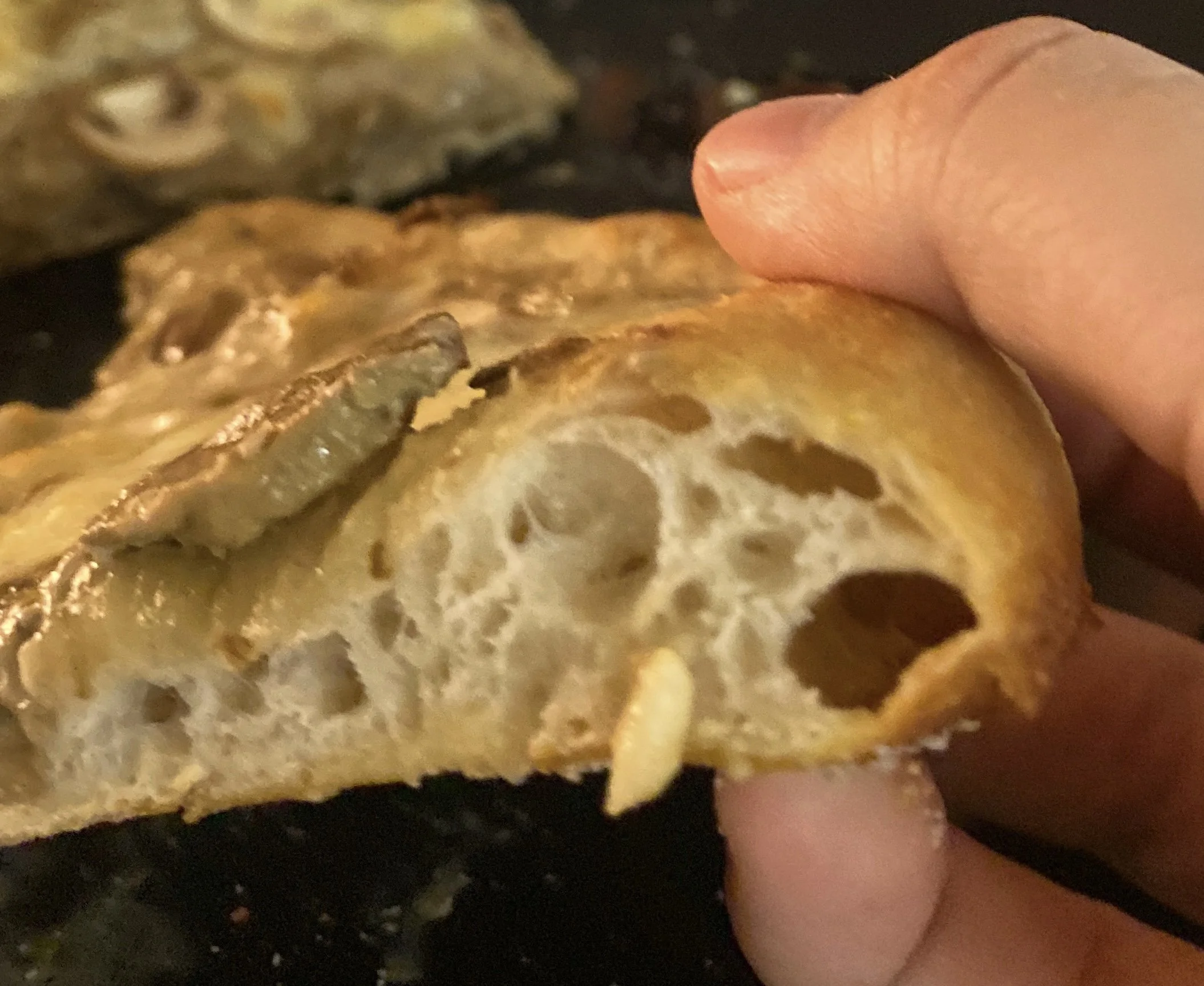 Dry dough = dry, dense crust. For airy pizza, you need more water than most recipes suggest. Bakers call this hydration.